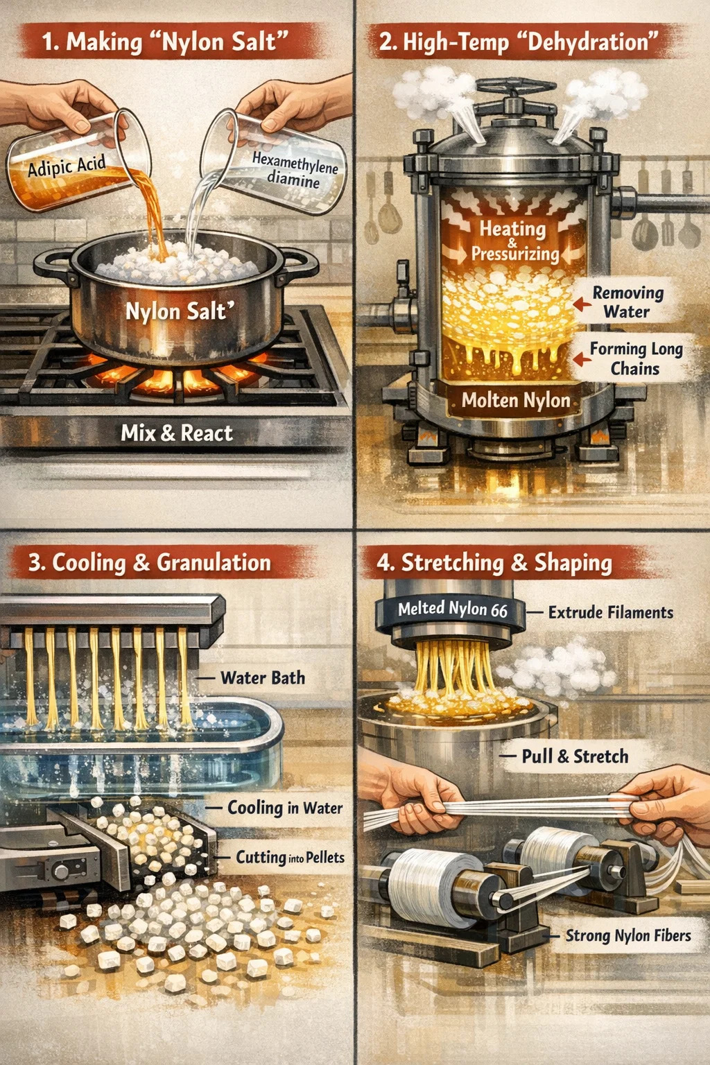 Nylon 66 , také známý jako polyamid 66, je jedním z nejpoužívanějších technických plastů na světě. Jeho výrobní proces je jako „vařit polévku“ a „tahat nudle“ v kuchyni s důrazem na přesné proporce a řízený ohřev.