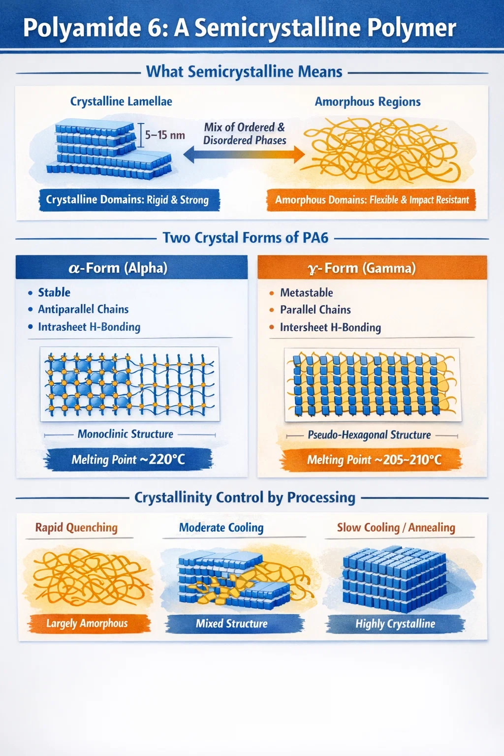 Polyamid 6 (PA6), široce známý jako Nylon 6 nebo polykaprolaktam, je a semikrystalický termoplastický polymer . To znamená, že současně obsahuje jak krystalické domény — oblasti, kde jsou molekulární řetězce uspořádány v uspořádaných, opakujících se vzorech —, tak amorfní domény, kde zůstává uspořádání řetězců neuspořádané. Není ani plně krystalický jako jednoduchý krystal soli, ani zcela amorfní jako obyčejné sklo.