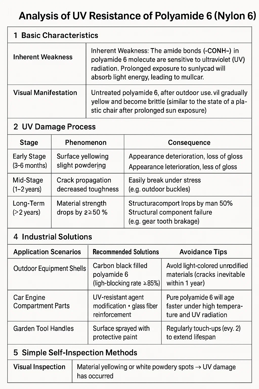 Inherentní slabina: Amidové vazby (-CONH-) v molekule polyamidu 6 jsou citlivé na ultrafialové (UV) záření. Dlouhodobé vystavení slunečnímu světlu absorbuje světelnou energii, což vede k přerušení molekulárního řetězce.