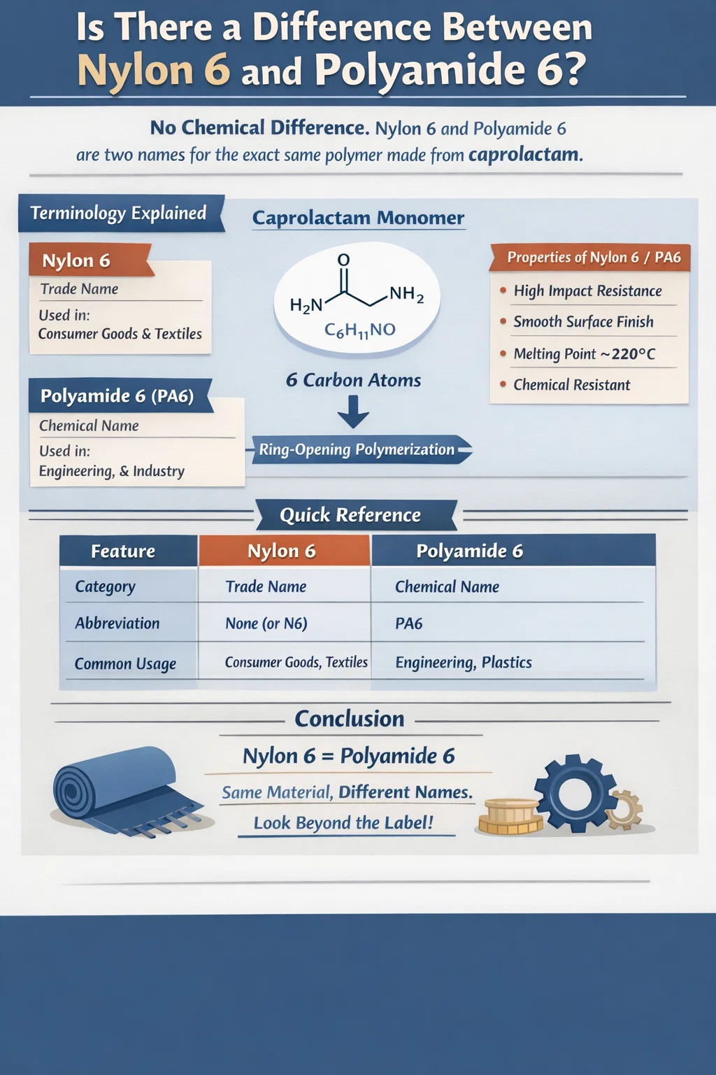 Zjednodušeně řečeno: mezi nylonem 6 a polyamidem 6 není žádný chemický rozdíl. Jsou to dva různé názvy pro přesně stejný polymer. „Nylon“ je dobře známý obchodní název původně vytvořený společností DuPont, zatímco „Polyamid“ je fnebomální chemický název používaný ve vědě a technice. Když vidíš Nylon 6 na etiketě spotřebitelského výrobku a Polyamid 6 v technickém listu odkazují na stejný materiál vyrobený z monomerů kaprolaktamu.